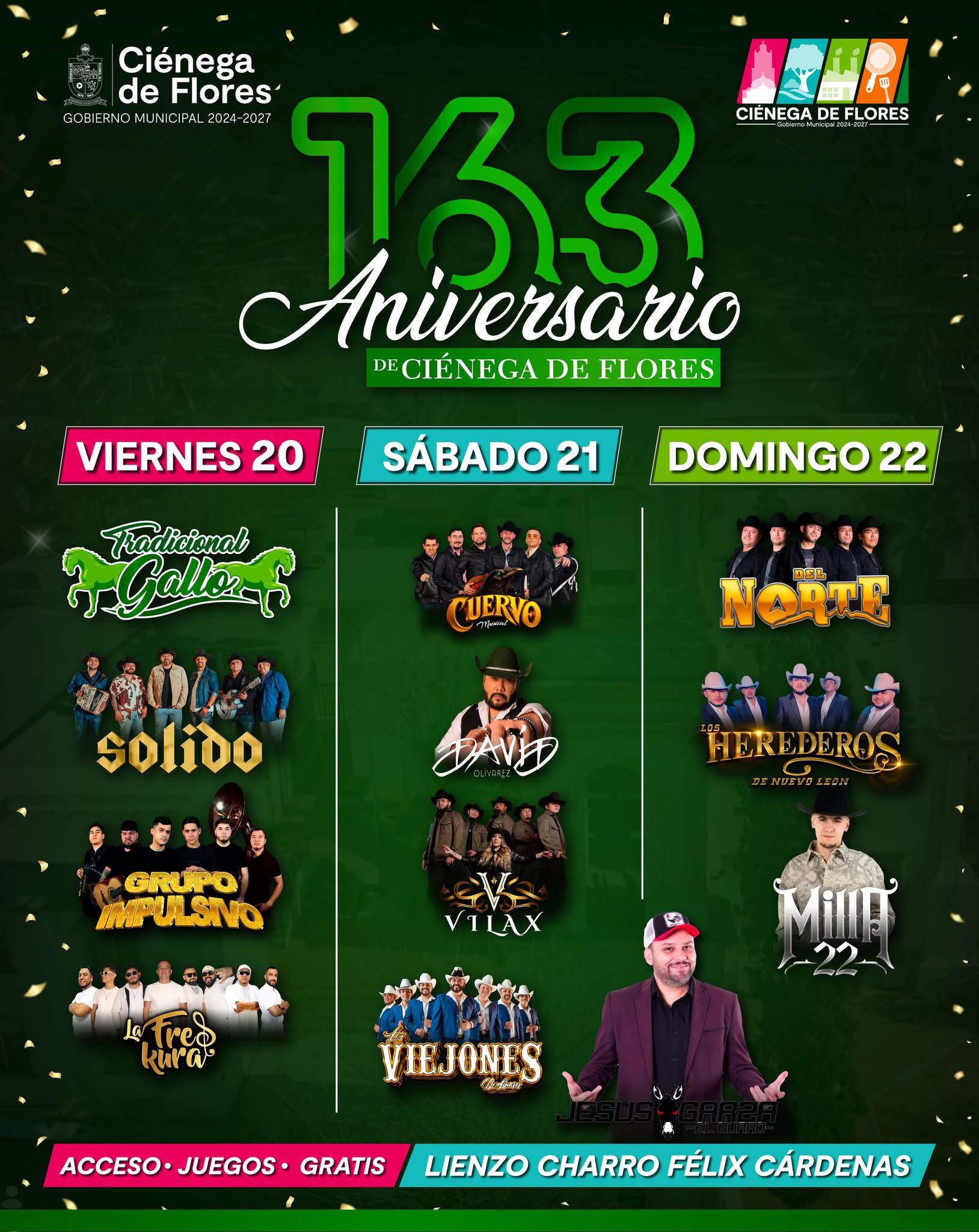 Del 20 al 22 de febrero se celebrará el 163 Aniversario de Ciénega de Flores en el Lienzo Charro Félix Cárdenas, con acceso y juegos gratuitos para el público. Durante tres días, el municipio conmemorará su fundación con conciertos en vivo, actividades recreativas y una programación pensada para familias, jóvenes y visitantes de la región.