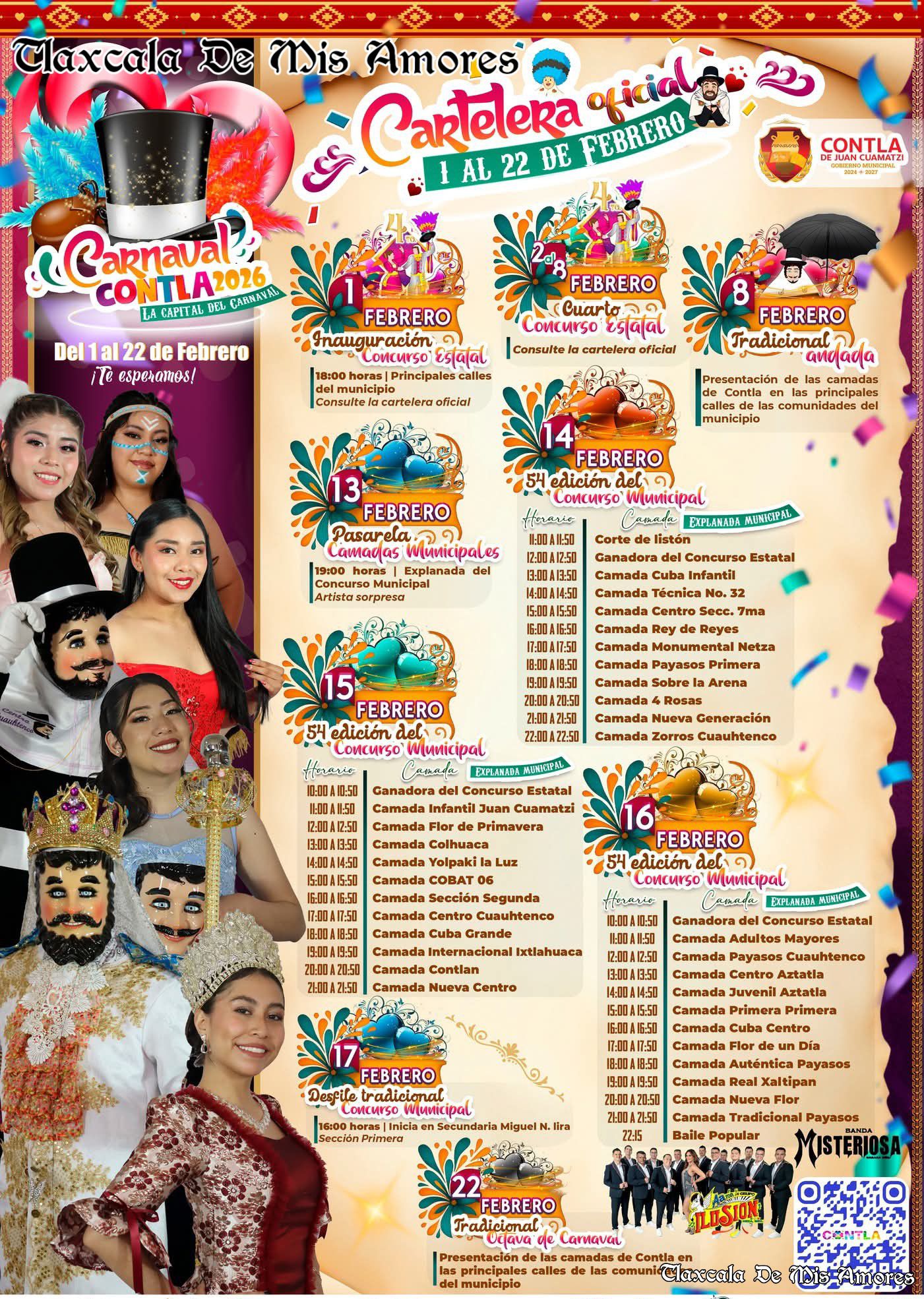 El Carnaval de Contla 2026 se llevará a cabo del 1 al 22 febrero, siguiendo la tradición de iniciar las celebraciones previas a la Cuaresma con danzas, comparsas y un movimiento cultural que distingue a este municipio. Contla de Juan Cuamatzi, ubicado en la zona centro–sur de Tlaxcala y muy cercano a Chiautempan, es reconocido por su actividad textil y por mantener uno de los carnavales más importantes del estado.