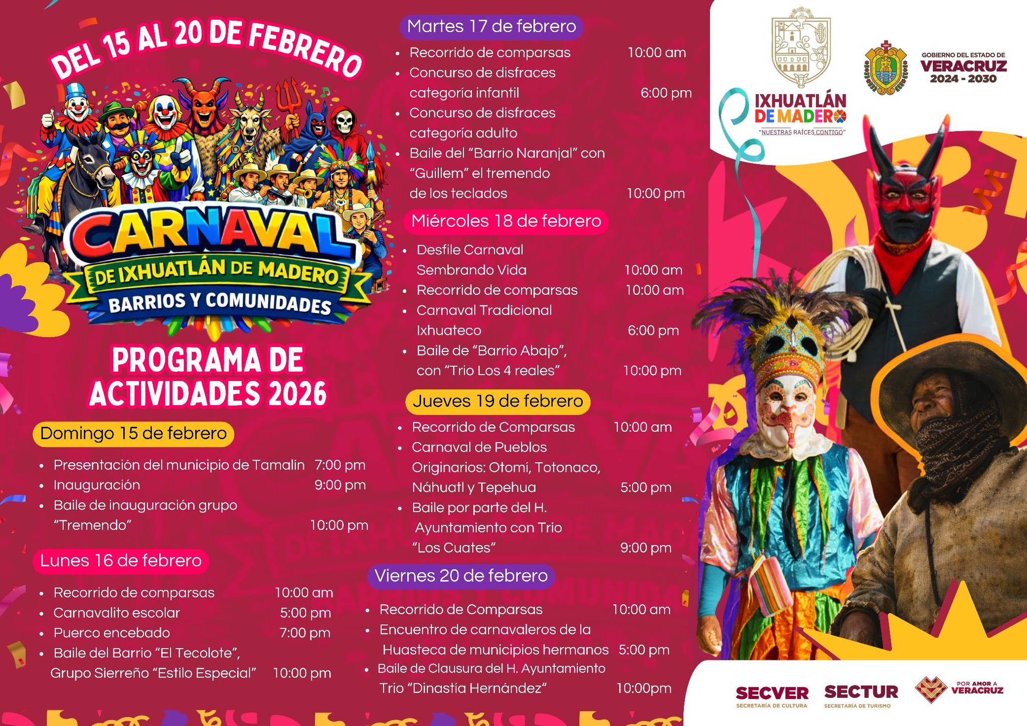 Del 15 al 20 de febrero se celebrará el Carnaval de Ixhuatlán de Madero 2026, Barrios y Comunidades, en este municipio del norte de Veracruz, con recorridos de comparsas, desfiles, concursos de disfraces, bailes populares y encuentros culturales que se desarrollarán en distintos puntos de la cabecera municipal. Durante seis días, barrios y localidades participarán activamente en una de las celebraciones más importantes del municipio.