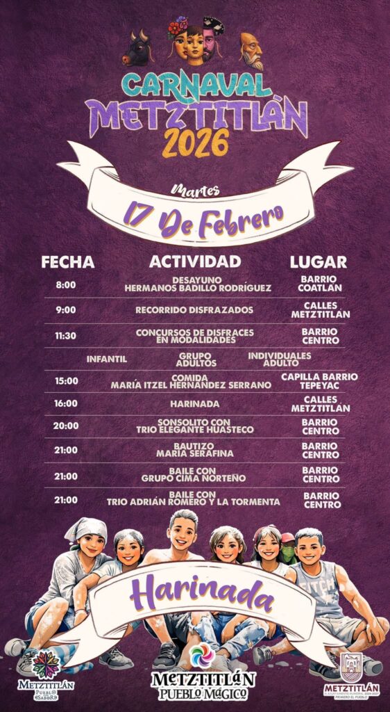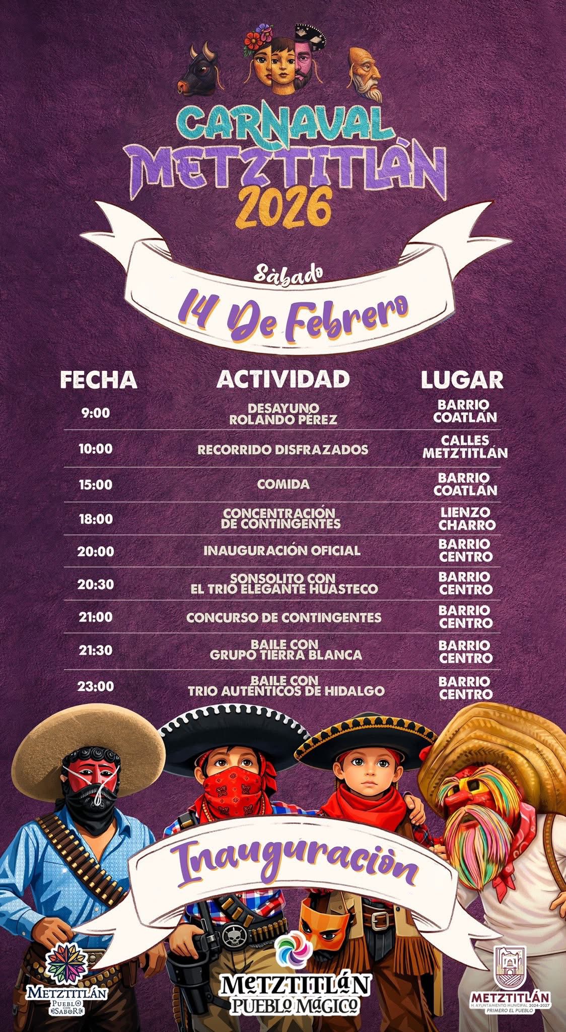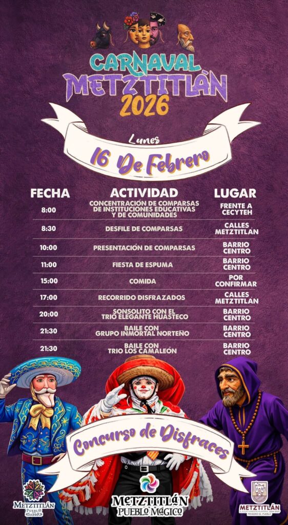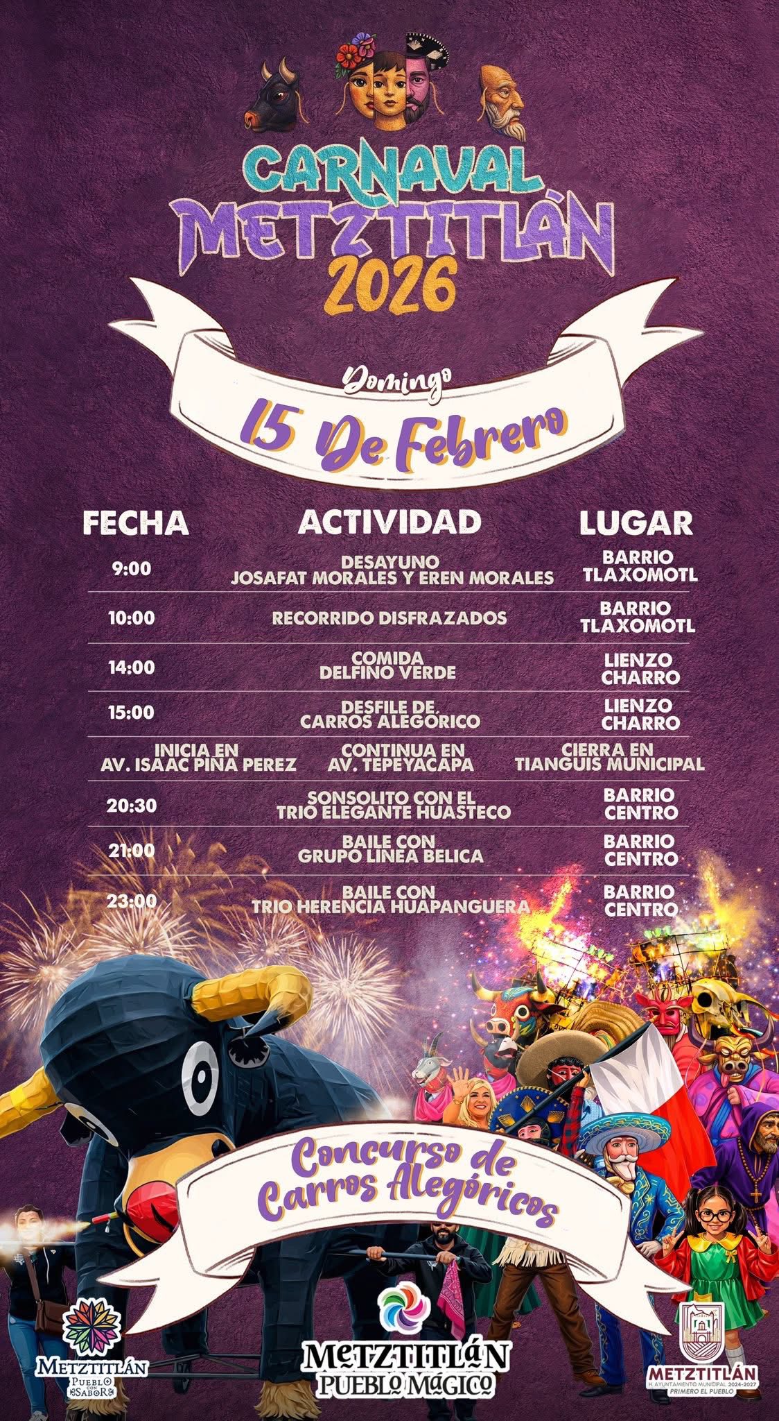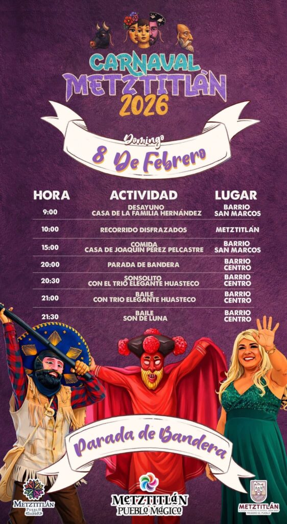 Del 8 al 17 de febrero de 2026 se llevará a cabo el Carnaval de Metztitlán, con sus tradicionales desfiles, danza y música que presentan un gran simbolismo y representación de las costumbres del pueblo y que al mismo tiempo, resultan atractivos para quienes llegan de fuera con interés en conocer tradiciones vivas.