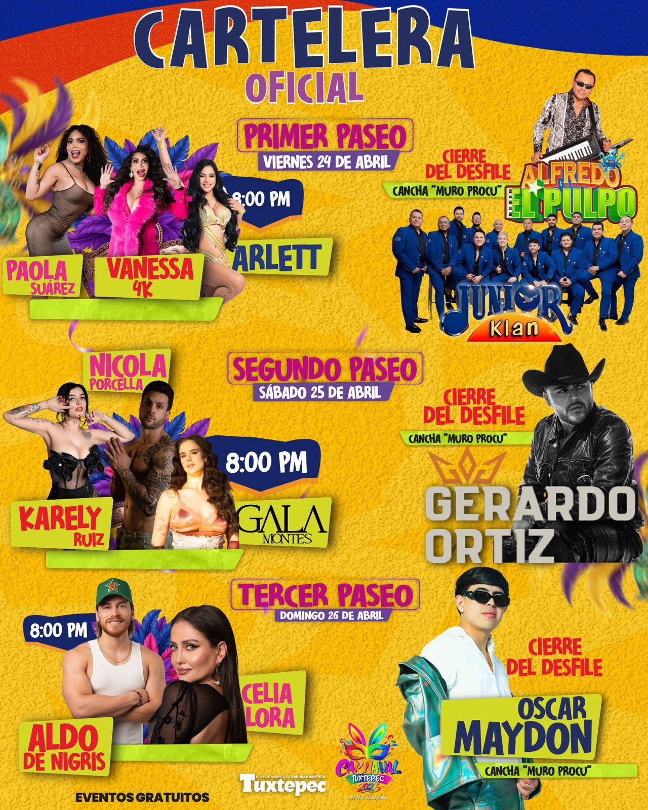 - Viernes 24 de abril (8:00 PM): Primer paseo con Paola Suárez, Vanessa 4K y Arlett; cierre con Alfredo “El Pulpo” y Junior Klan
