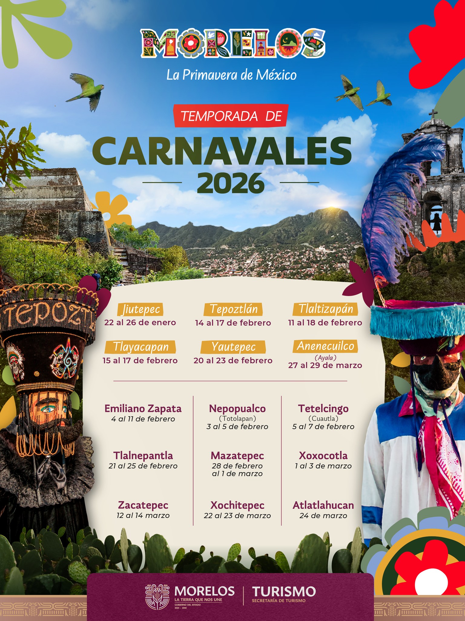 Ya está aquí la Temporada de Carnavales 2026 en Morelos: una serie de fiestas locales con comparsas, música en vivo, bailes, desfiles, coronación de reyes del carnaval y el “brinco del chinelo”, personaje típico del estado, con máscara, sombrero alto y un baile de saltos al ritmo de banda.