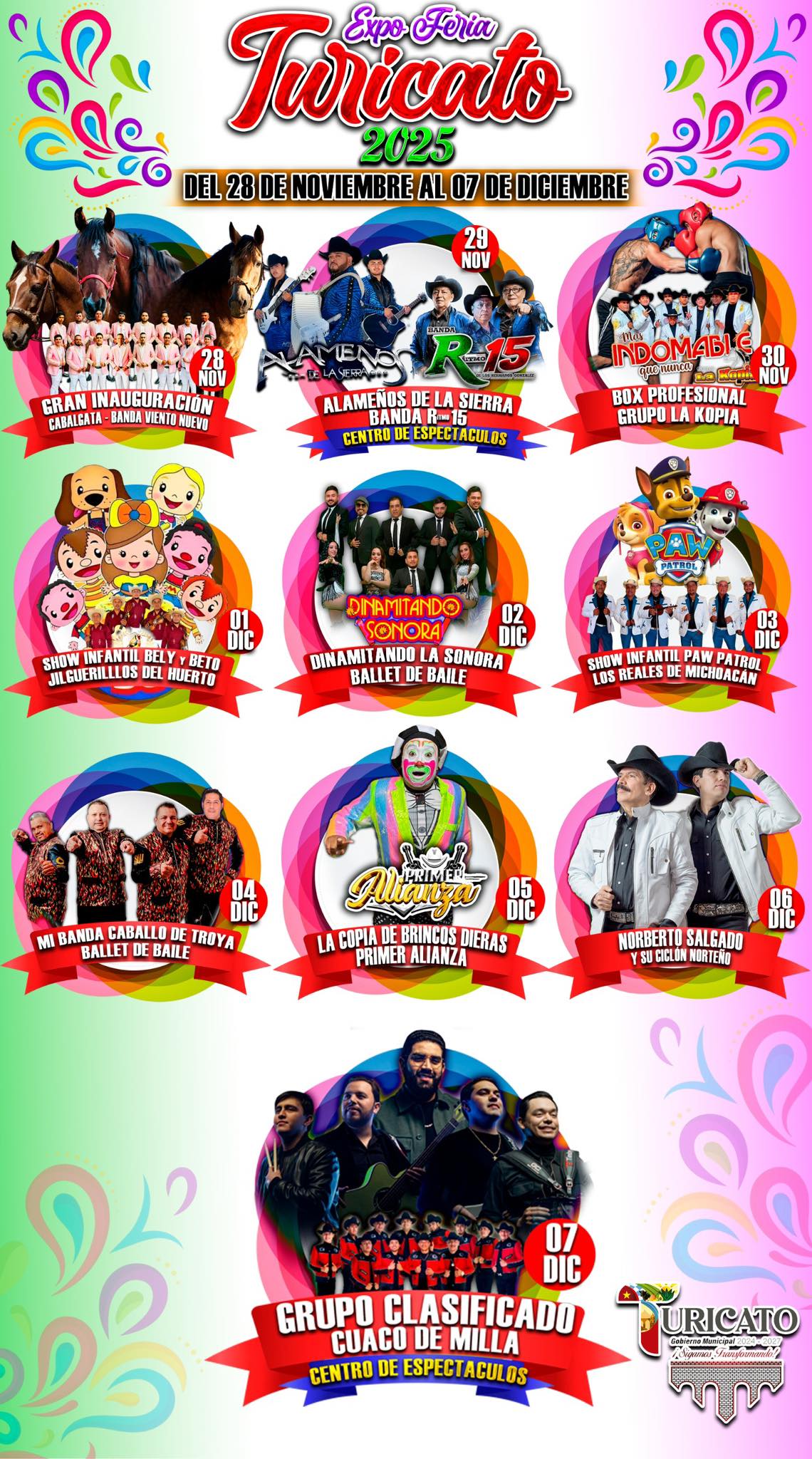 El 29 de noviembre se presentarán Los Alameños de la Sierra y Banda R15; el 30, una función de box profesional junto al grupo La Kopa. Para los más pequeños, el 1 de diciembre se presentarán Bely y Beto junto a Los Jilguerillos del Huerto, y el 3 llegará el show de Paw Patrol acompañado de Los Reales de Michoacán.