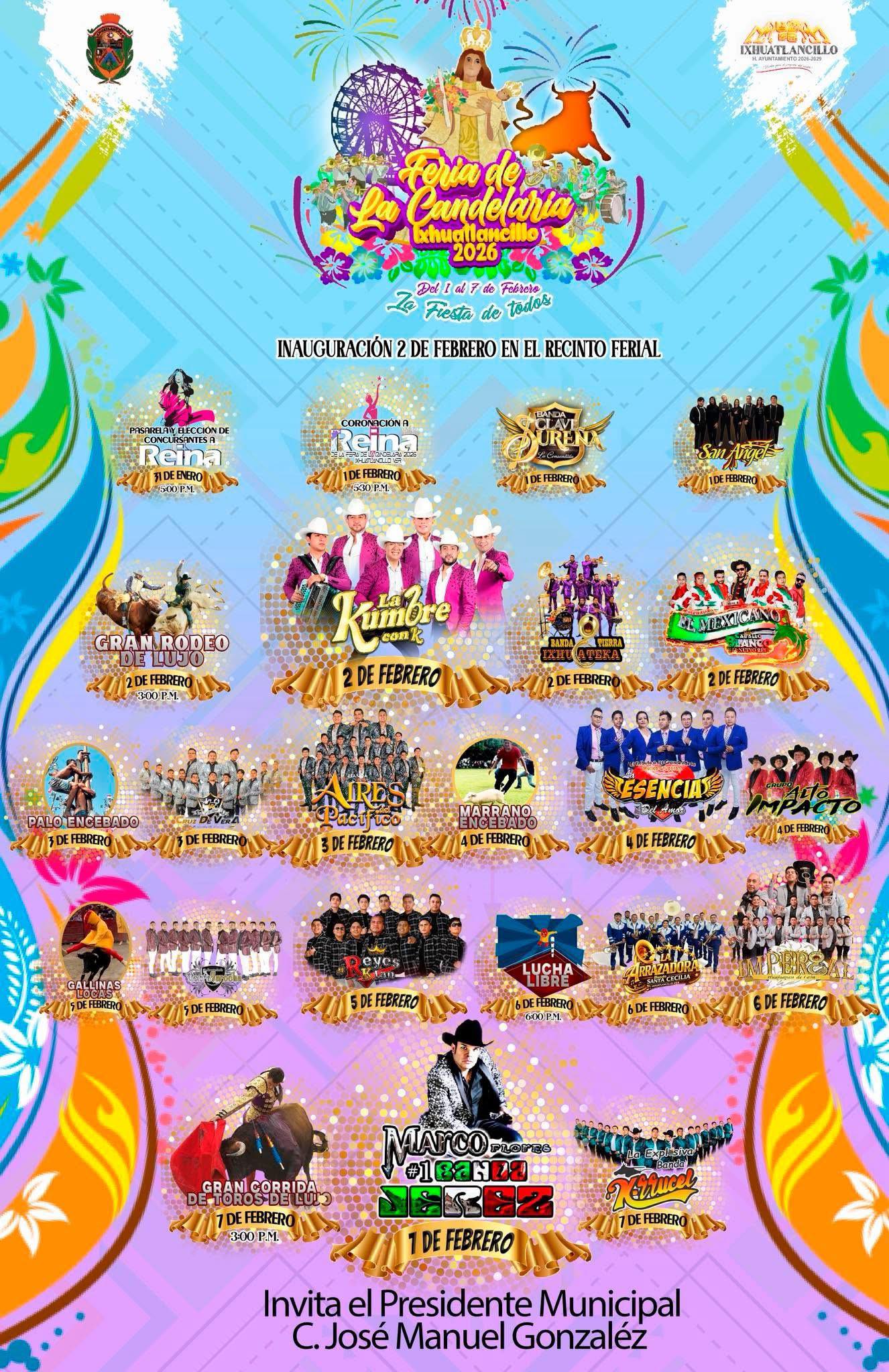 En el apartado musical, hasta el momento se encuentran confirmadas las presentaciones anunciadas en el cartel oficial, entre ellas La Kumbre con K, Mi Nueva Banda El Mexicano y Banda Tierra Ixhuateka, además de la participación de Banda Aires del Pacífico, programada para el 3 de febrero. El programa artístico se desarrollará principalmente en el teatro del pueblo, con acceso para público local y visitantes de municipios cercanos.