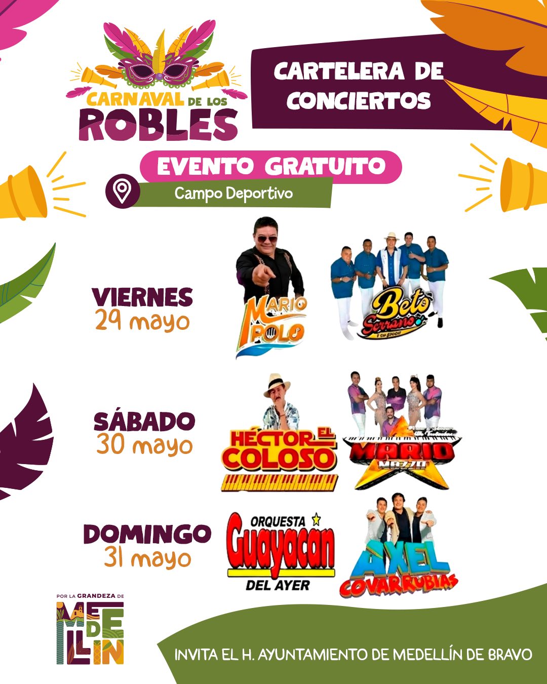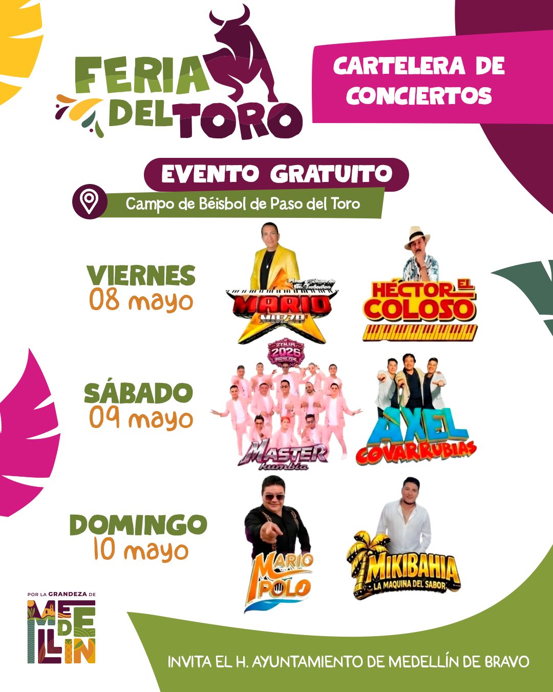 Este mes de mayo no te pierdas los increíbles eventos que se celebrarán en Medellín de Bravo: la Feria del Mango, la Feria de la Piña, la Feria del Toro y el Carnaval Medellín 2026. Cada uno de estos eventos incluirán increíbles eventos musicales, conciertos, bailes y mucho más.