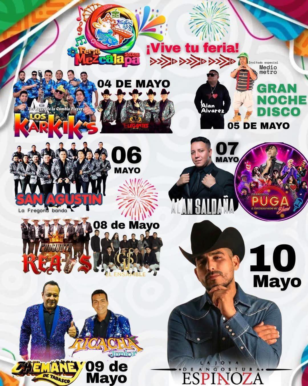 Del 4 al 10 de mayo se celebrará la Feria Mezcalapa 2026 en el municipio de Mezcalapa, Chiapas, una festividad organizada para honrar las tradiciones locales y ofrecer una semana completa de actividades culturales, musicales y recreativas para habitantes y visitantes. Este evento se lleva a cabo en la cabecera municipal y ofrecerá atracciones como el teatro del pueblo, zona de juegos mecánicos, área gastronómica y escenarios para espectáculos nocturnos.