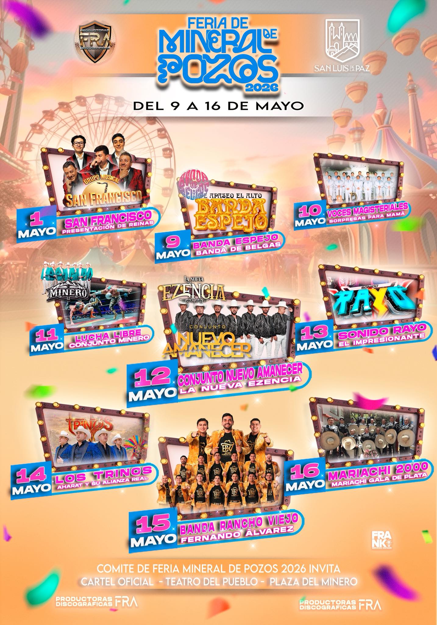 Del 9 al 16 de mayo se celebrará la Feria Mineral de Pozos 2026. Aquí te compartimos el programa general que incluye bailes, eventos culturales, folclor, tradición y mucho más. Asiste con toda tu familia y disfruta de grandes atracciones y el mejor ambiente popular.