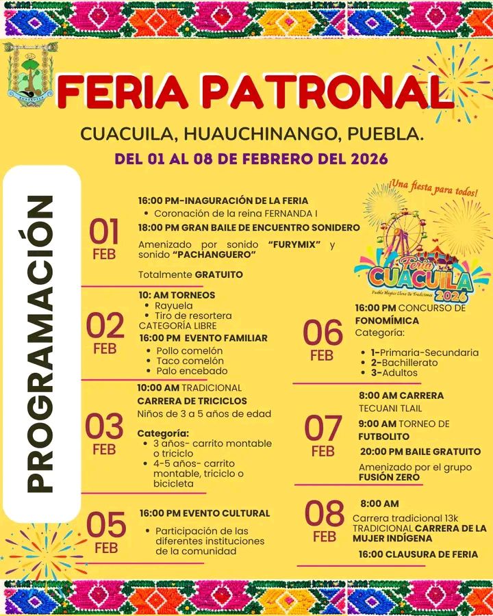 Del 1 al 8 de febrero se celebrará la Feria Patronal Cuacuila 2026 en la localidad de Cuacuila, una semana de actividades públicas que combina celebraciones religiosas, eventos culturales, competencias deportivas y bailes abiertos, dirigidos tanto a la población local como a visitantes de la Sierra Norte de Puebla.