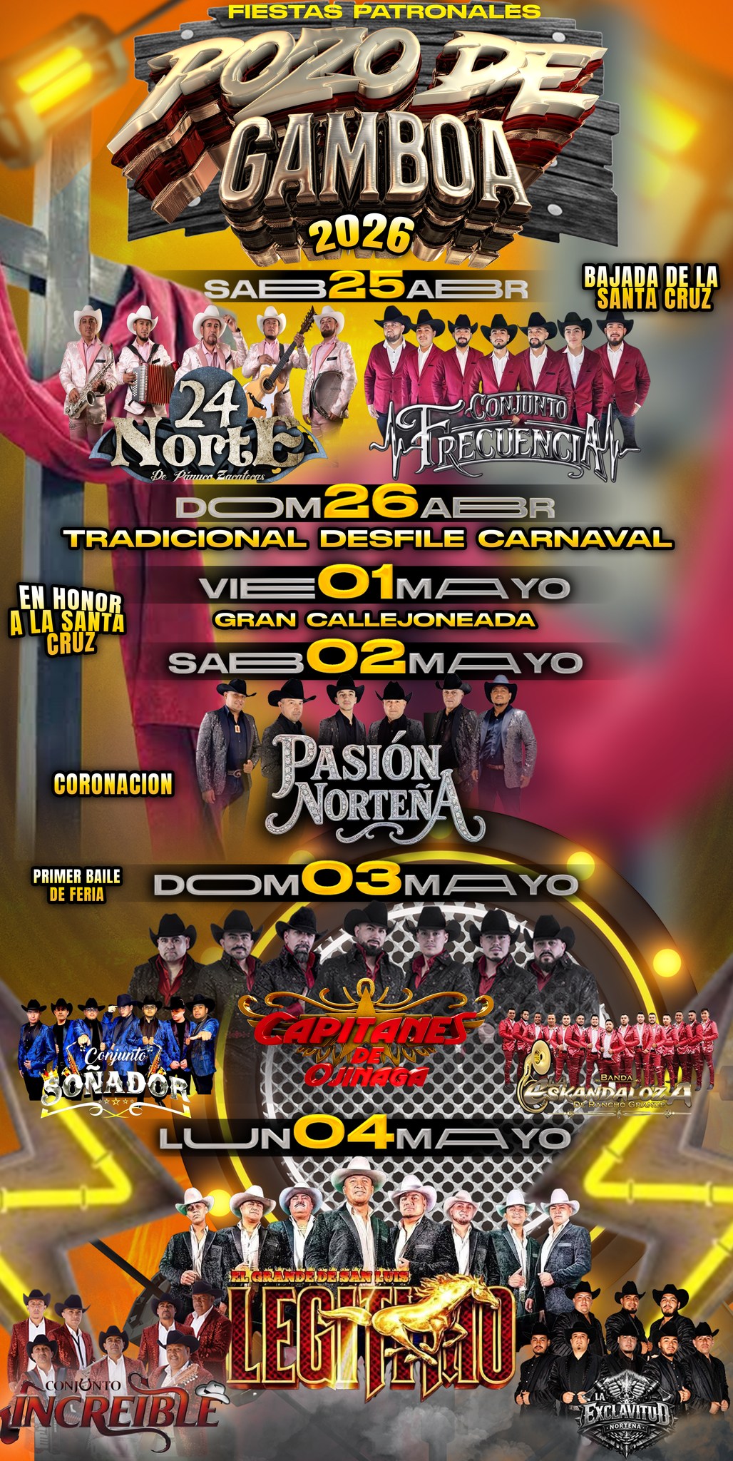 - 3 de mayo: primer desfile de feria, Conjunto Soñador, Capitanes de Ojinaga, Banda Eskandaloza