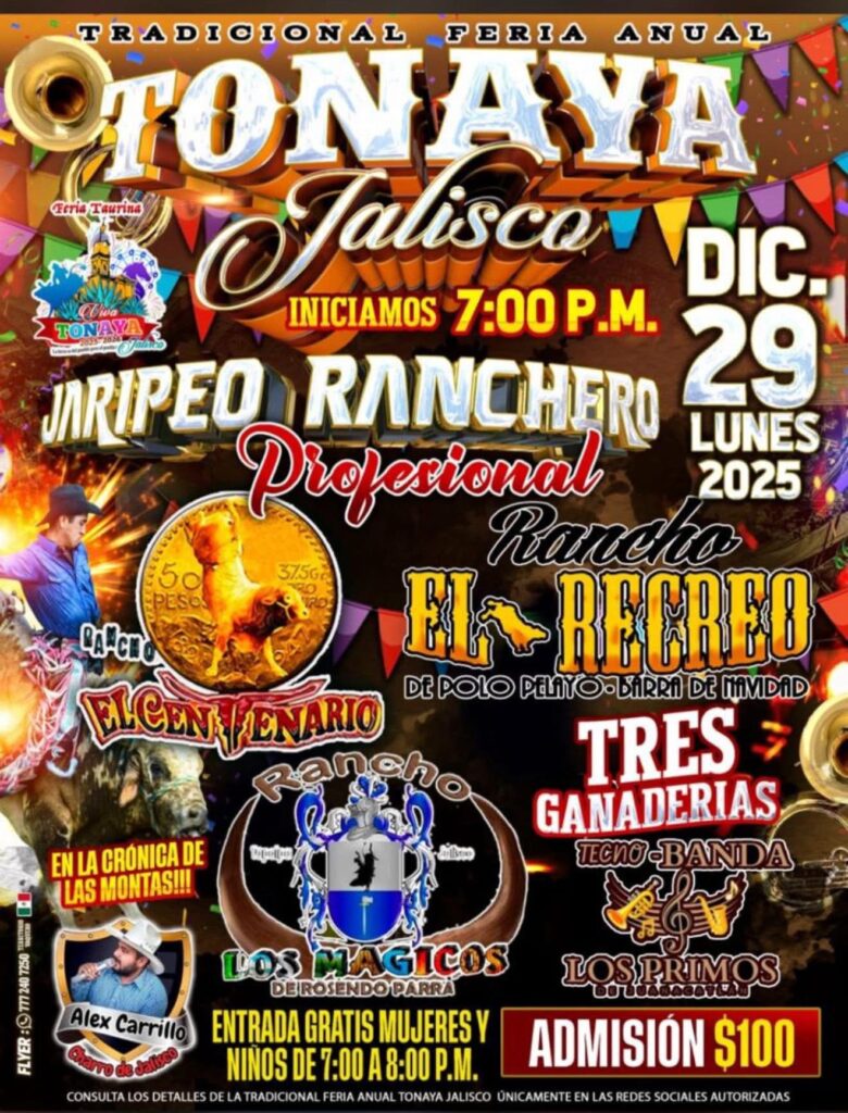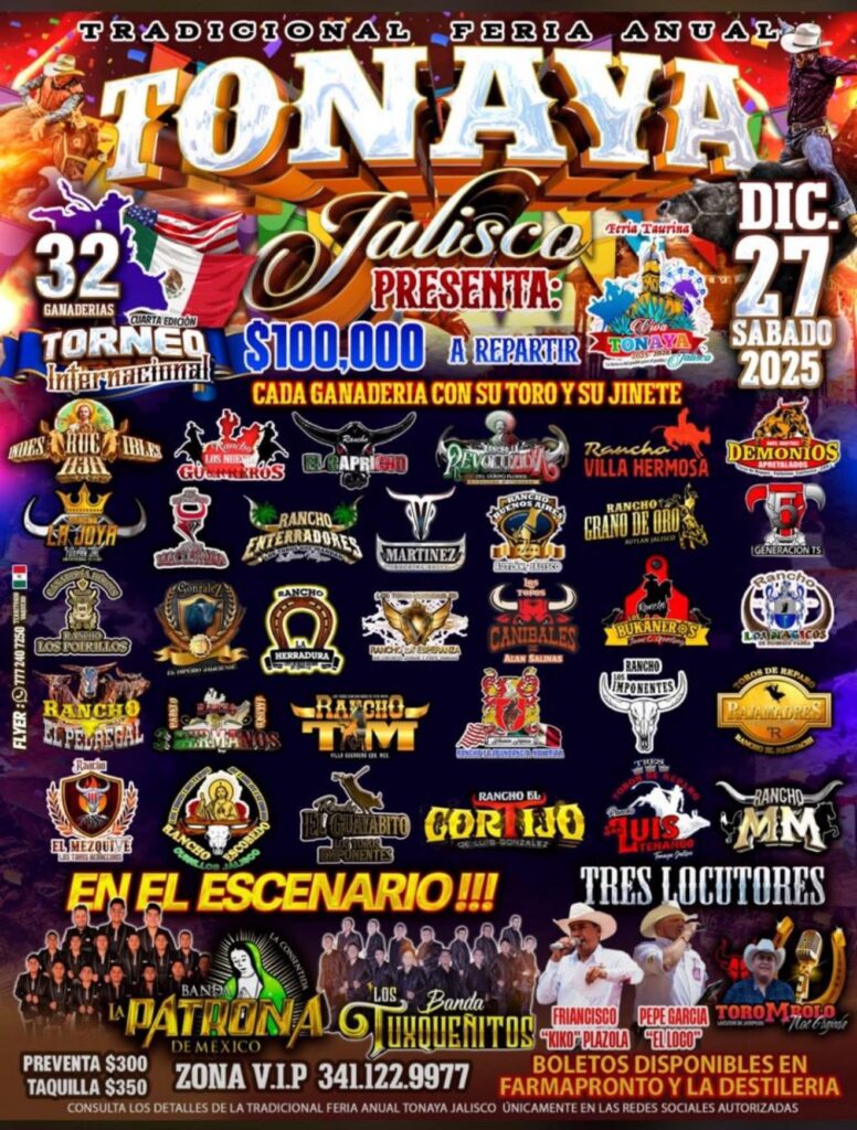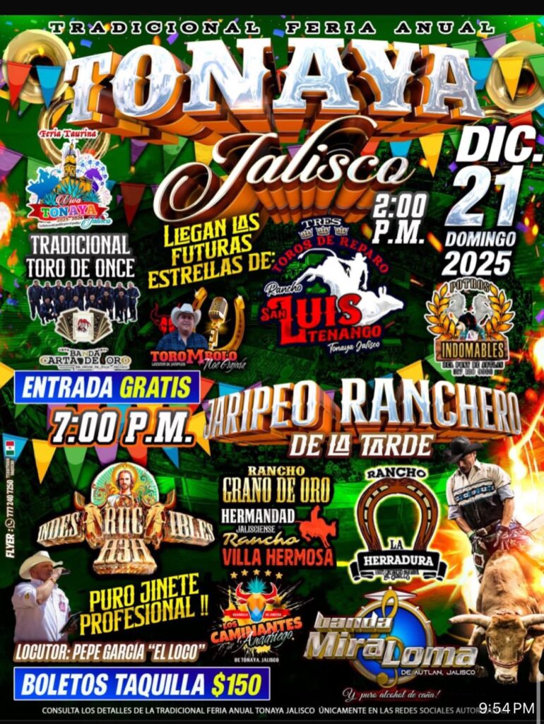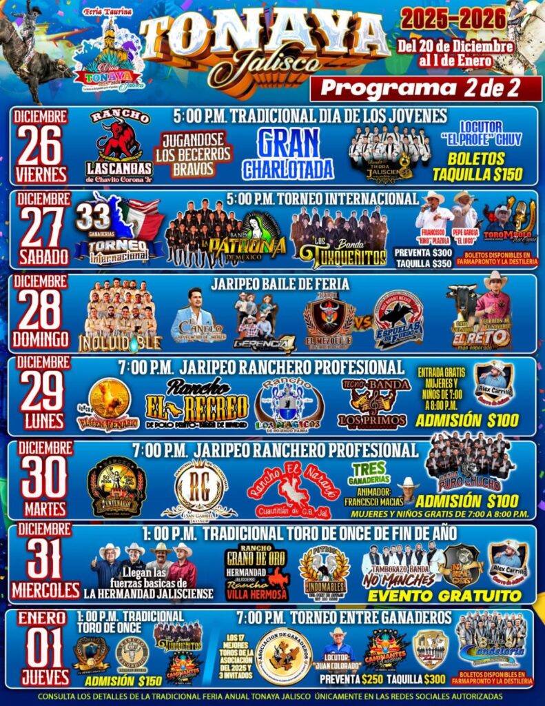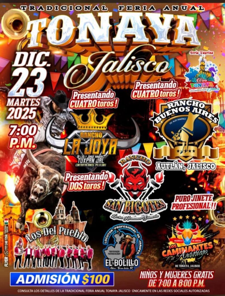 La Feria Taurina Tonaya 2025-2026 llegará una vez más a la Plaza de Toros Viva Tonaya con la mejor organización de jaripeos, competencias entre ganaderías, presentaciones musicales y espectáculos para toda la familia. Este municipio del sur de Jalisco, conocido por su producción agrícola, su tradición charra y la presencia de ranchos dedicados al ganado de lidia, concentra durante diciembre una de sus celebraciones más concurridas.